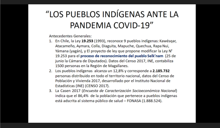 Para eso, Millalen compartió con los presentes parte de la estrategia de apoyo comunicacional que han realizado con las comunidades: “compartimos información en medios radiales en lengua de los pueblos originarios, las recomendaciones las estamos haciendo de forma bilingüe, tenemos muchas reuniones a través de videoconferencia donde podemos conversar con la comunidad y así monitorear la situación de salud”.