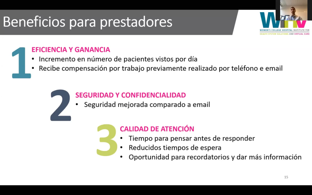 El profesional presentó un proyecto de atención primaria virtual creado en medio de la pandemia de COVID-19 en Canadá. “Los pacientes pueden elegir entre mensajería asincrónica, audio o videollamada. Para los mensajes, los prestadores tienen hasta dos días para responder. El proyecto tuvo 194 prestadores de atención primaria y 14 mil pacientes registrados en seis meses”, afirmó.