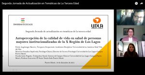 La académica de UDLA fue invitada a exponer el trabajo de tesis de Magister en Gerontología Clínica Interdisciplinaria que realizó en la Universidad Santo Tomás de Puerto Montt en el año 2019 en conjunto con la trabajadora social Claudia León, Gestora de Campos Clínicos de Universidad de Los Lagos; y Mauricio González, Director de la Carrera de Psicología del mismo plantel, cuya temática abordó la percepción sobre su calidad de vida en salud de 68 personas mayores residentes de seis Establecimientos de Larga Estadía para Adultos Mayores (ELEAM) de la Región de Los Lagos.