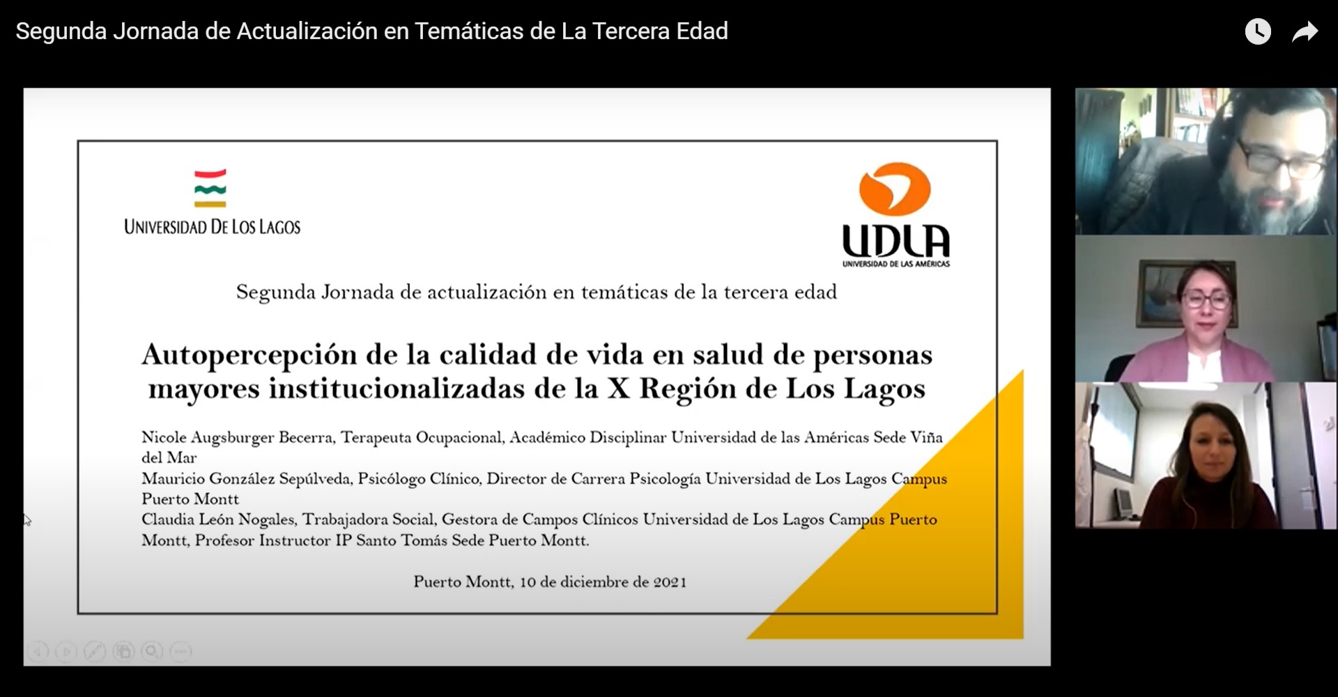 Con la ponencia “Autopercepción de la calidad de vida en salud de personas mayores institucionalizadas de la Región de Los Lagos”, la académica de la carrera de Terapia Ocupacional de Sede Viña del Mar, Nicole Augsburger, participó en la Segunda Jornada de Actualización en Temáticas de la Tercera Edad de la Universidad de Los Lagos.