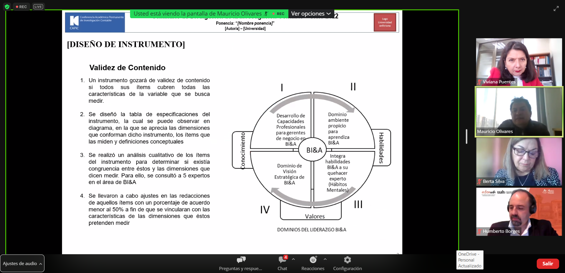 A través de un proceso metodológico basado en la taxonomía de Marzano y sistema Phyton, su estudio está focalizado en medir competencias en las personas que toman decisiones y desarrollan el liderazgo en las empresas, sobre todo en el área de la contabilidad y gestión. Para ello se desarrolló un sistema que les permitió obtener información de Linkedin e Indeed, dos redes sociales de ofertas laborales, así como también información de los programas académicos de las universidades, para poder hacer un ranking de las competencias duras y blandas más solicitadas en Chile. Con ello afirmó que “el uso de estrategias basadas en el conocimiento, más la utilización de este tipo de herramientas, estadísticas y tecnológicas, van a transformar esa información y poder lograr un conocimiento desde el punto de vista estratégico, táctico y operativo en las organizaciones y, por lo tanto, se podrán tomar mejores decisiones, lograr un buen manejo del riesgo y control de gestión, la gestión contable en este caso”, finalizó.
