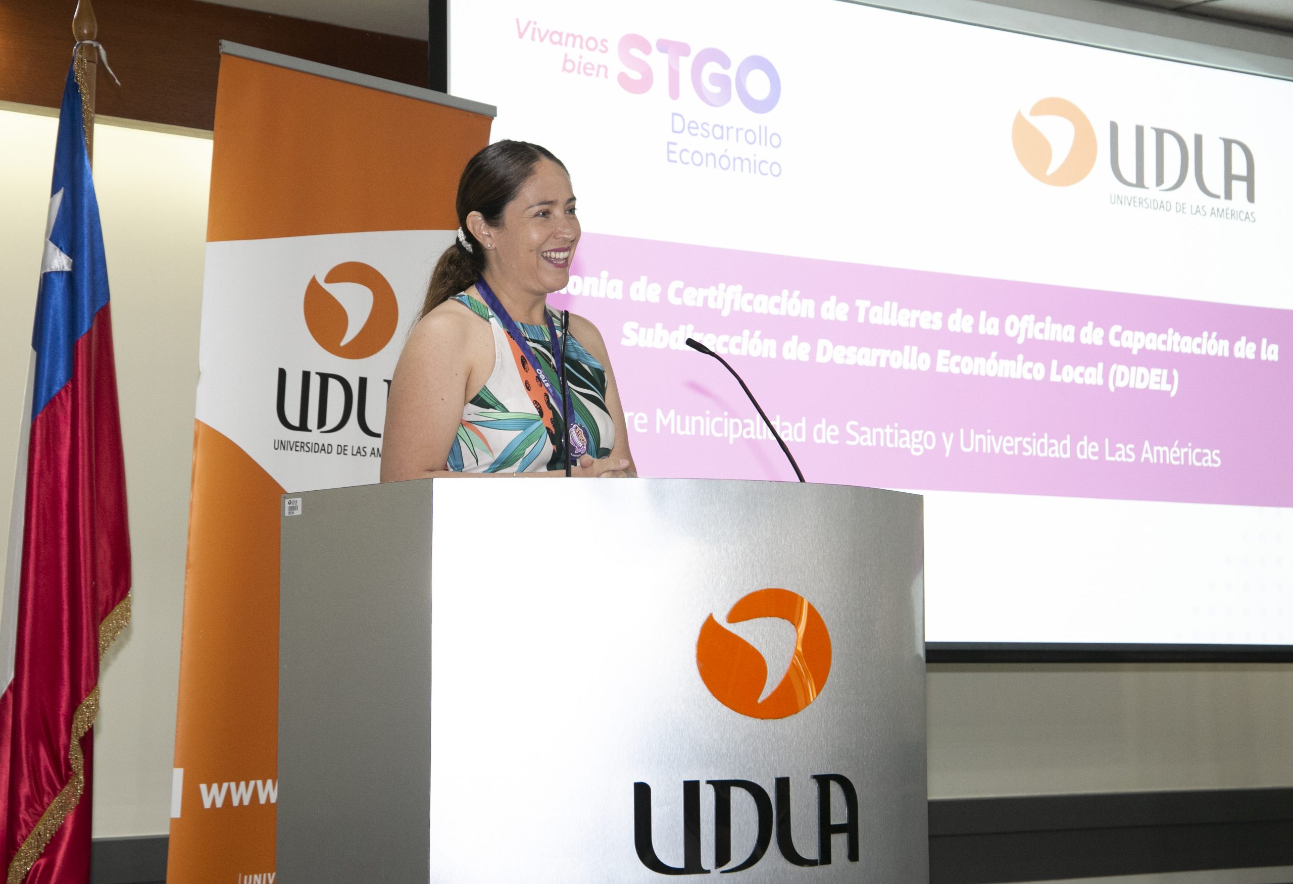 En la entrega de diplomas estuvieron presentes autoridades de UDLA y de la Municipalidad de Santiago. Entre ellas, Gonzalo Islas, Decano de la Facultad de Ingeniería y Negocios y Cynthia Vivallo, subdirectora de la Dirección de Desarrollo Económico Local (DIDEL).