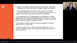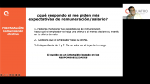 Sobre en qué momento abordar la temática salarial, los expositores apuntaron que “siempre es preferible que el empleador abra la conversación salarial. Si te pide que indiques tus expectativas salariales, puedes responder con algo como: “Estoy seguro de que la empresa tiene un rango salarial competitivo para este puede y estaría interesado en escuchar la oferta tienen en mente”.