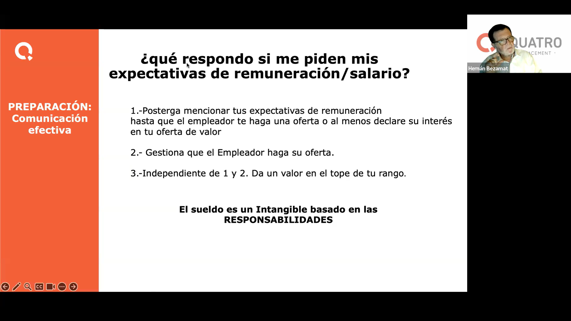 Para responder preguntas sobre tus expectativas salariales, Bezamat entregó algunos consejos basados en “ser honesto y realista, basándote en tu propia investigación previa. Si no estás seguro del rango exacto, puedes proporcionar un rango amplio en lugar de un número especifico. Debes considerar el paquete completo: además del sueldo base, toma en cuenta beneficios como seguro médico, bonos, oportunidades de desarrollo profesional, vacaciones, teletrabajo, etc”.
