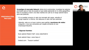 “Para hablar de este tema debemos prepararnos y para eso debemos realizar una investigación de mercado. También debemos tener claro mi aporte de valor, mis logros y mi motivaciones; con qué yo podría contribuir a la empresa. Asimismo, tiene que existir una preparación con respecto a la comunicación”, afirmó.