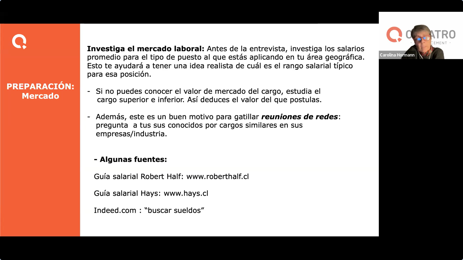 Con respecto a la investigación de mercado, Carolina Horman afirmó que antes de la entrevista la persona debe “mirar los salarios promedio para el tipo de puesto al que está aplicando en tu área geográfica. Esto te ayudará a tener una idea realista de cuál es el rango salarial típico para esa posición. Si no puedes conocer el valor de mercado del cargo, estudia el cargo superior e inferior y así deduces el valor del que postulas”.