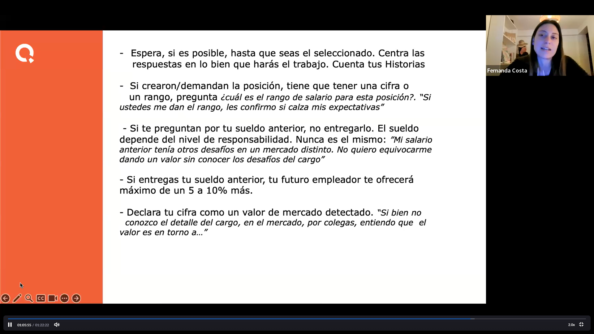 A través de sesión online, Hernán Bezamat y Carolina Horman, parte de O4 Outplacement, empresa dedicada a servicios de reinserción laboral y empleabilidad, entregaron herramientas para cerrar un buen acuerdo entre empleado y empleador. Algunos de los tópicos que se abordaron fue cuándo es adecuado hablar de remuneración, cómo gestionar las expectativas de renta y cómo negociar beneficios u otras condiciones del puesto de trabajo.