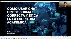 El curso fue realizado en dos sesiones impartidas por Eduardo Fuentes, Doctor en Biotecnología y posdoctorado de la Universidad de St. Andrews, de Escocia, quien además ha desarrollado el software WriteWise, el cual guía y ayuda en el proceso de escritura mediante el uso de IA.