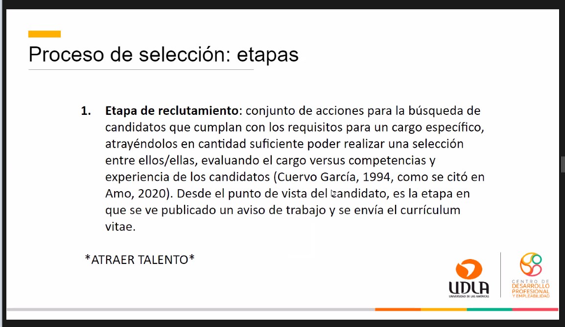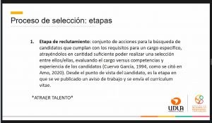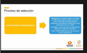 La charla también tuvo un bloque dedicado a los procesos de selección donde la especialista abordó los objetivos y etapas; las estrategias que pueden seguirlas personas que están en la búsqueda de trabajo, los canales donde se publican las ofertas laborales, la construcción de un buen Currículum Vitae (CV) y cómo enfrentar de buena manera una entrevista laboral.