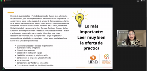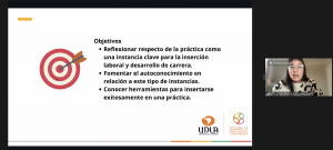 Sol Salas, psicóloga de la Universidad de Chile, con más de seis años de experiencia en orientación profesional y desarrollo de carrera, comenzó la charla explicando la práctica profesional se entiende como una “instancia académico-profesional en la que los estudiantes de una carrera trabajan y ponen en práctica sus conocimientos y habilidades en un espacio laboral concreto, recibiendo retroalimentación y evaluación acerca de su desempeño”.