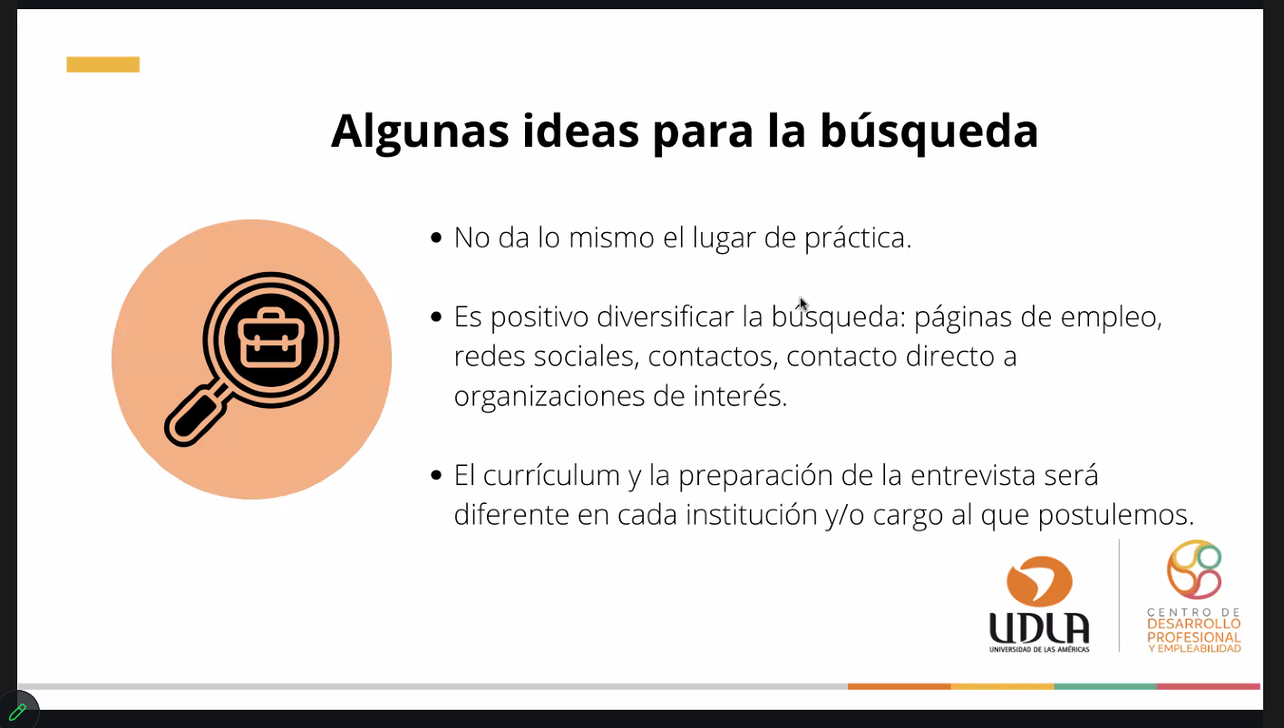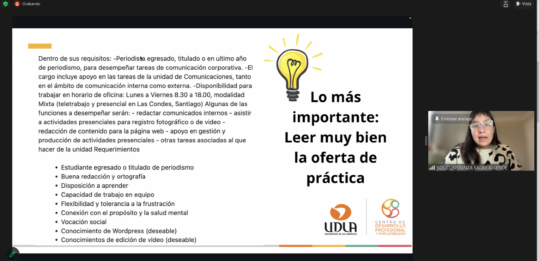 Encontrar una práctica profesional acorde a sus objetivos profesionales y personales, es un crucial para los estudiantes que están cursando sus últimos años en la educación superior. Con el fin de acompañarlos en este proceso, el Centro de Desarrollo Profesional y Empleabilidad de UDLA organizó un taller donde se abordaron temáticas enfocadas en cómo escoger una buena práctica, la relevancia que esta tiene para el desarrollo de carrera y cómo tener un buen desempeño y sacarle el mejor provecho posible cuando se realice.