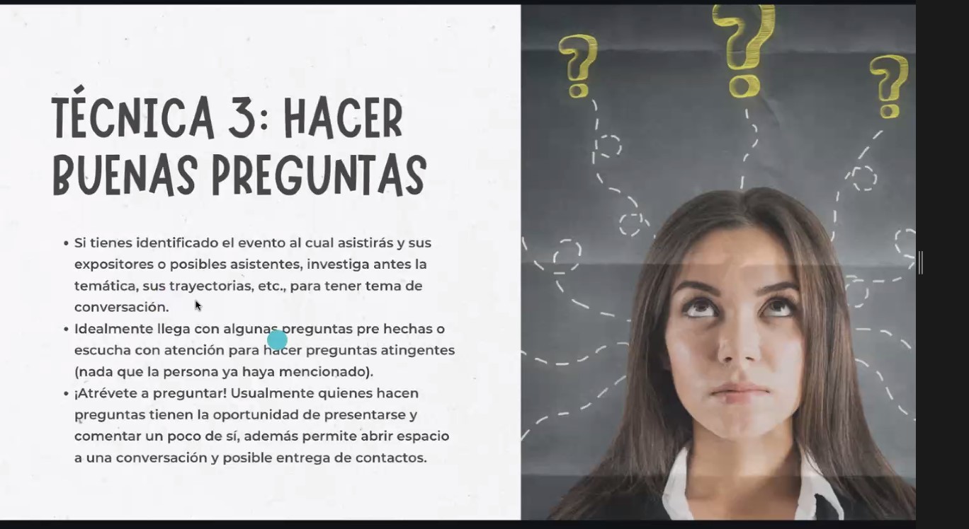 La segunda parte del taller consistió en conocer diferentes técnicas para un networking efectivo. Algunas de ellas son: