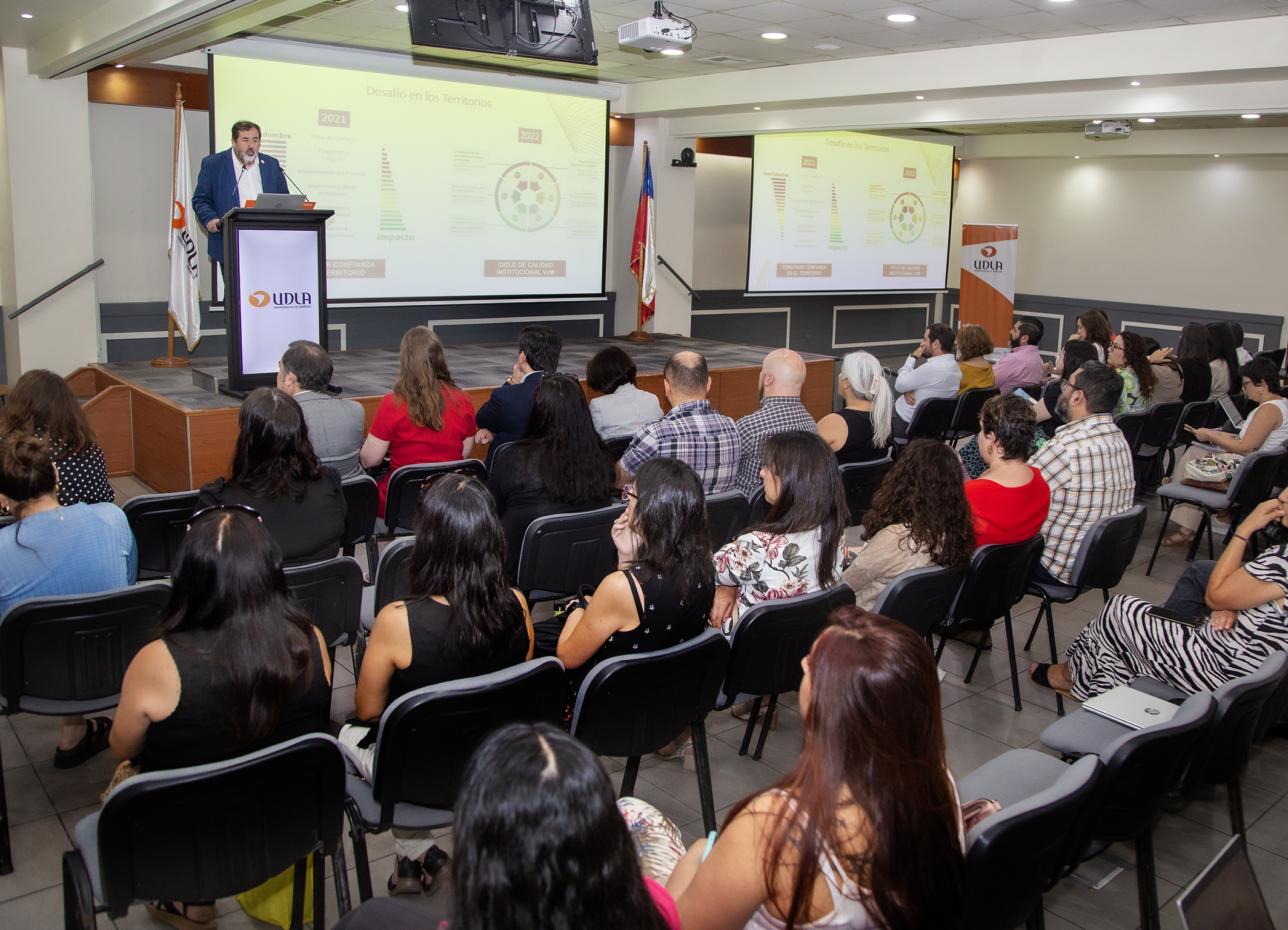 Universidad de Las Américas llevó a cabo la Segunda Jornada de Buenas Prácticas de Vinculación con el Medio en el auditorio del Campus Providencia. Este encuentro tuvo como objetivo compartir los logros alcanzados en esta área y reflexionar sobre las estrategias que fortalecen la colaboración con las comunidades.