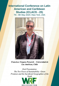 Francisco Vergara, Director del Centro Producción del Espacio UDLA presentó la ponencia “The Two Faces of Sustainability: Green Promises and the Sacrificial Geographies of the South” en la International Conference on Latin American and Caribbean Studies (ICLACS-25), que se celebró en Nueva York, Estados Unidos, el 7 y 8 de mayo.
