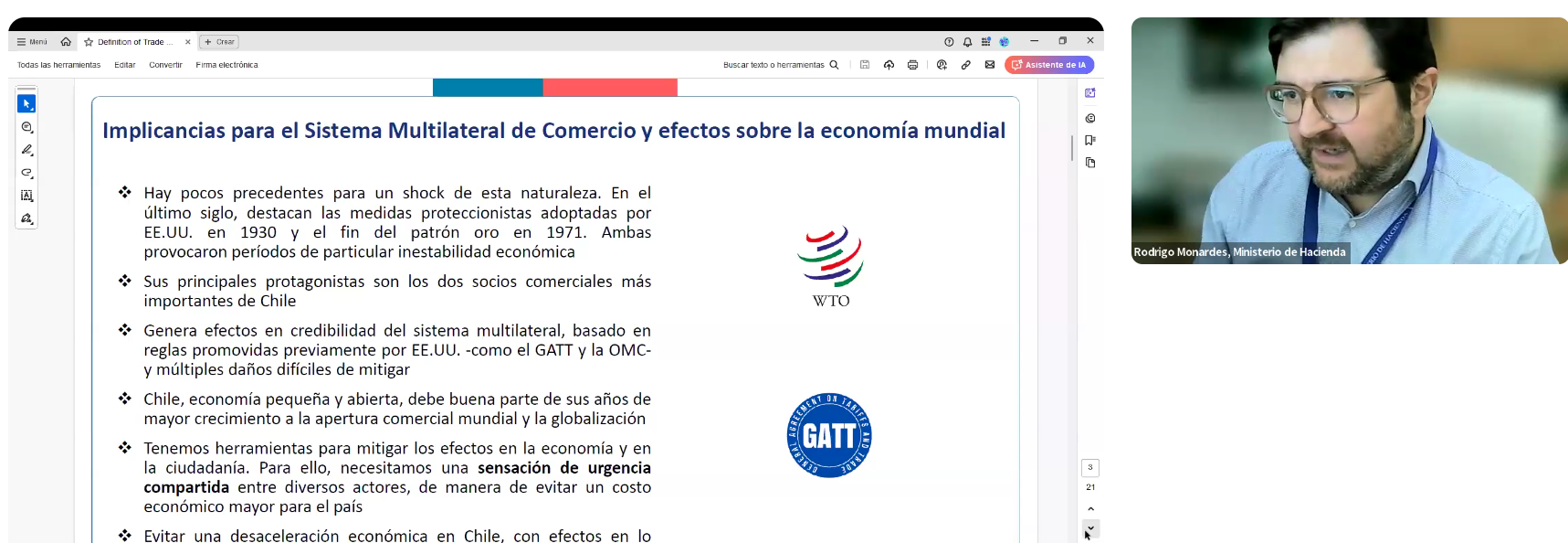 Durante la actividad, el expositor Monardes analizó el complejo escenario actual de las relaciones comerciales internacionales, y analizó cómo las medidas arancelarias y el conflicto comercial pueden afectar a Chile, principalmente por la dependencia de sus exportaciones y la integración en cadenas globales. Señaló que estas tensiones generan incertidumbre y riesgos en los mercados internacionales, lo que repercute directamente en la economía chilena.