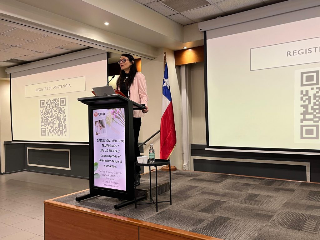 En la actividad expuso Marisa Villagrán, matrona y psicóloga, Magíster en Psicología y profesora asociada de la Universidad de Chile, quien presentó la ponencia “La experiencia del parto y su impacto en la formación de vínculos tempranos”.