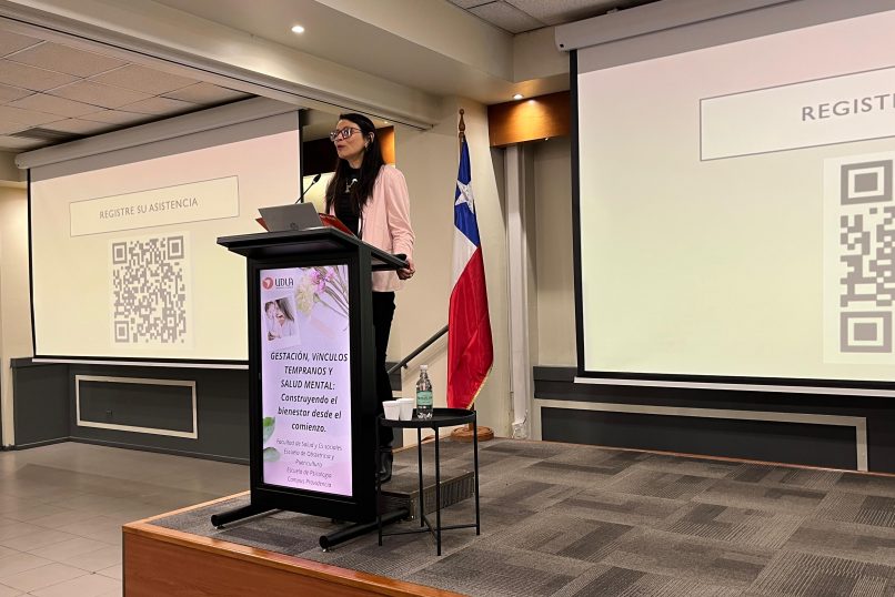 Maricela Pino, Directora de Escuela de Obstetricia y Puericultura, explicó que la jornada nace “en el contexto de fomentar la interdisciplina en temáticas que vinculan a dos carreras en las que estamos en el acompañamiento de las personas en todo el curso de la vida, y justamente, una de las temáticas importantes es el nacimiento y cómo las experiencias tempranas de vinculación afectan nuestra salud mental durante toda la vida”.