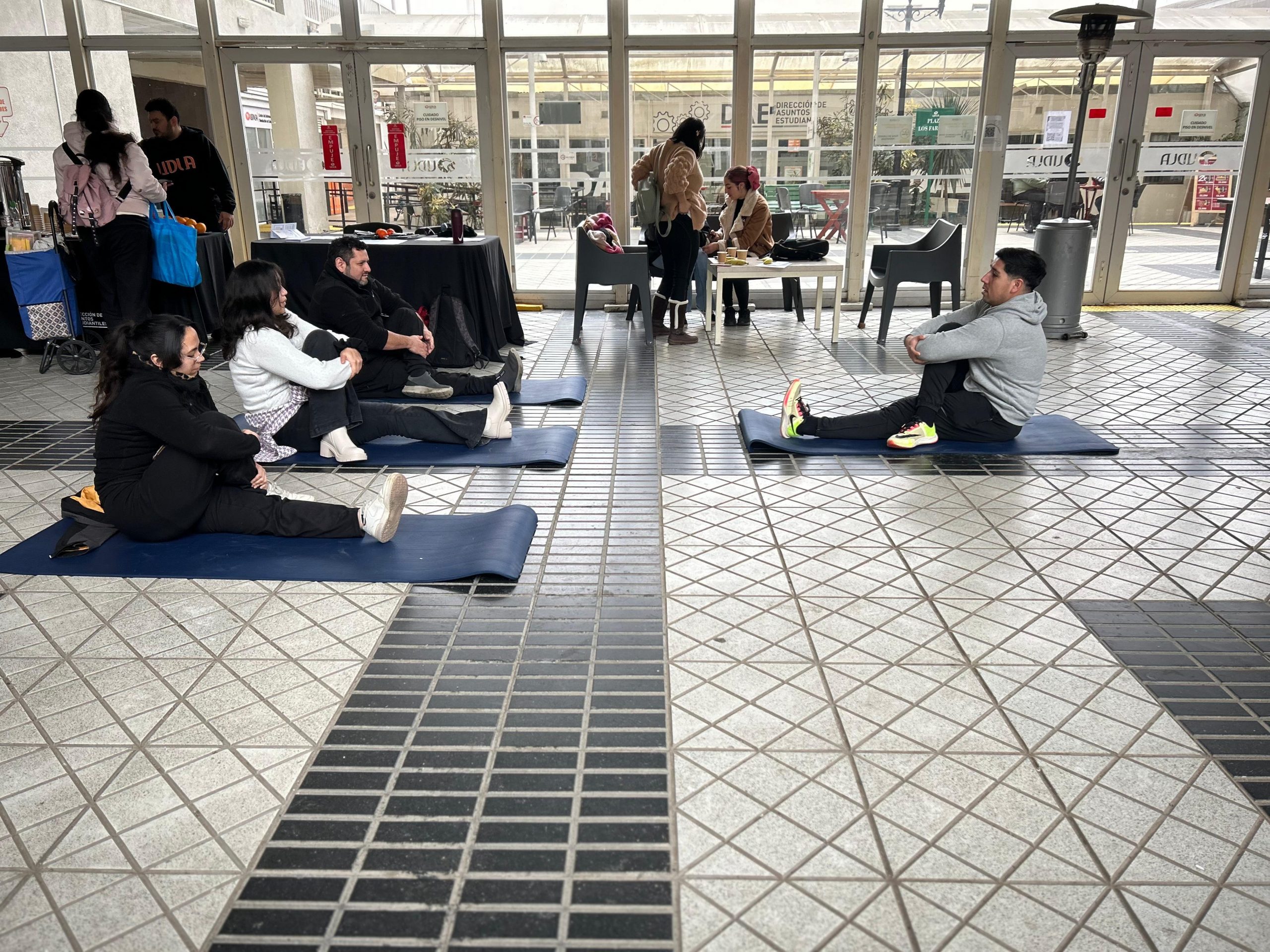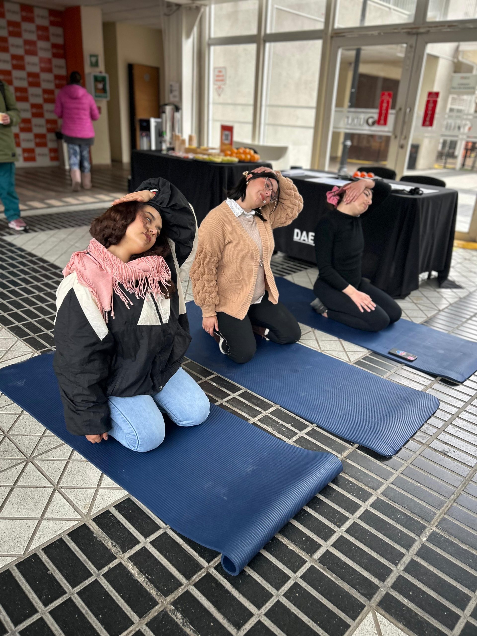 La iniciativa se realizó en el hall central del campus y estuvo enfocada en entregar información y herramientas prácticas sobre los beneficios de la elongación y la movilidad articular, creando un espacio de relajación que permitiera reducir el estrés previo a la semana de exámenes. Junto a la actividad física, se ofreció café, frutas, barras de cereal y premios para quienes participaron.