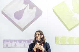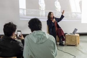 Durante la charla, explicó cómo su exposición buscaba transformar el espacio público mediante instalaciones que abordaran temas de menstruación y lactancia. Diseñó un “amamantadero” junto a la vitrina de la galería para que quienes amamantan pudieran sentirse protegidas, pero al mismo tiempo visibilizar su práctica en la ciudad.