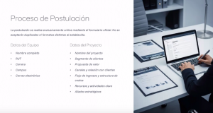 Es preciso señalar que el proceso cuenta con las siguientes etapas: Postulación; Talleres de Acompañamiento; Asesoría a los Finalistas; Premios, Bootcamp y Premiación; y Rendición de Fondos. Ingresando aquí se puede obtener toda la información.