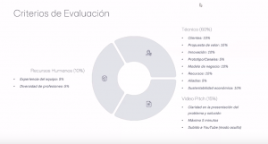 Los criterios de evaluación son los siguientes: técnico (60%), video pitch (15%) y recursos humanos (10%). En la imagen adjunta se puede ver el detalle de cada uno de ellos.