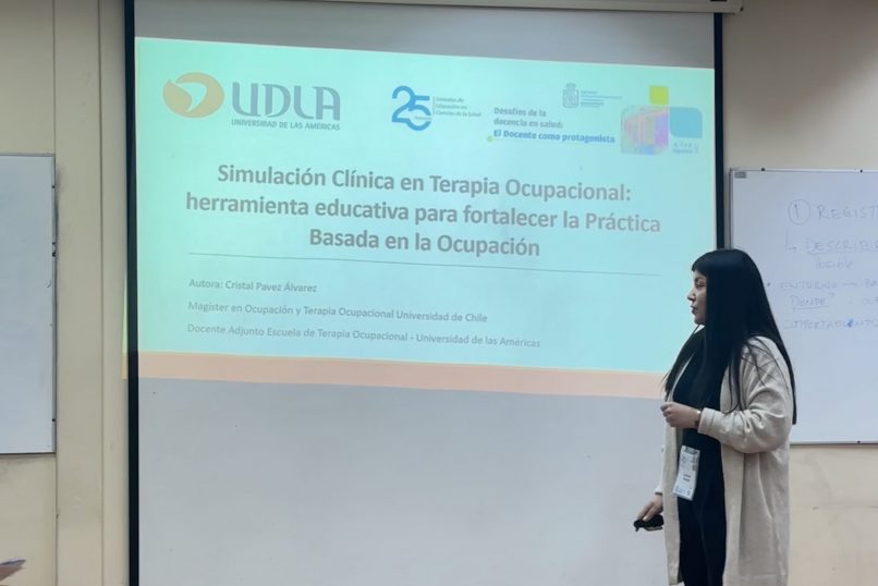 La investigación, titulada “Simulación Clínica en Terapia Ocupacional: herramienta educativa para fortalecer la práctica basada en la ocupación”, fue expuesta por la académica de la Facultad de Salud y Ciencias Sociales de UDLA Cristal Pavez, y aborda cómo la simulación clínica de alta fidelidad puede potenciar la formación de terapeutas ocupacionales, reforzando el enfoque centrado en la ocupación y la aplicación del proceso terapéutico en entornos intrahospitalarios.