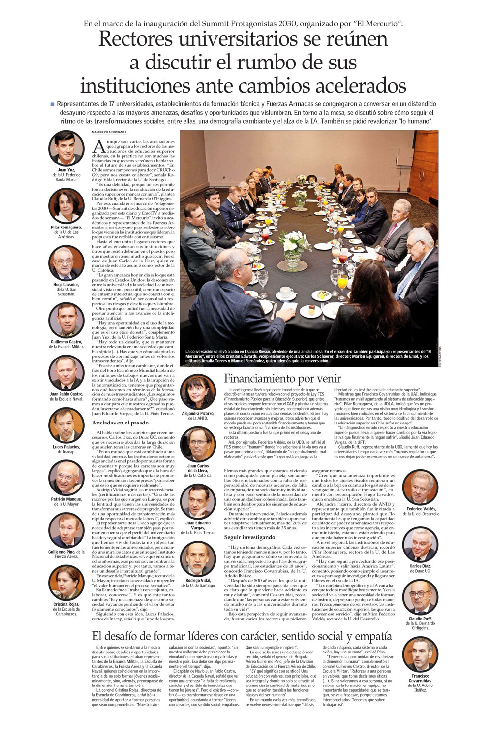 Foto Rectora desayuno en Protagonistas 2030La Rectora, Pilar Romaguera, asistió a un encuentro con rectores de instituciones de educación superior (IES) en el marco de la octava edición de Protagonistas 2030, Summit de Educación Superior que organiza El Mercurio, actividad anual sobre ciencia e innovación al que acudieron más de 5 mil escolares, y en el que expusieron dos académicos de UDLA, de las facultades de Ingeniería y Negocios, y de Salud y Ciencias Sociales.