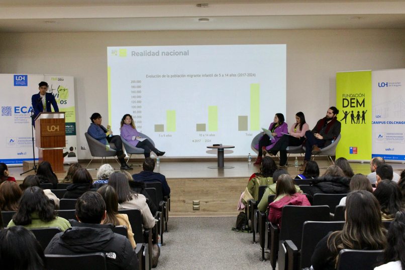 La académica expuso en la mesa junto a Valeria Acuña, psicóloga comunitaria-clínica e investigadora en Infancia Migrante; Juan Pablo González, sociólogo y jefe de estudios del Servicio Jesuita a Migrantes; y las representantes de Fundación DEM, Daniela Leal, supervisora técnica y Francisca Romero, directora AFT.