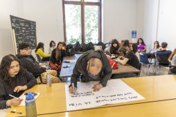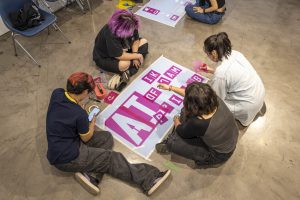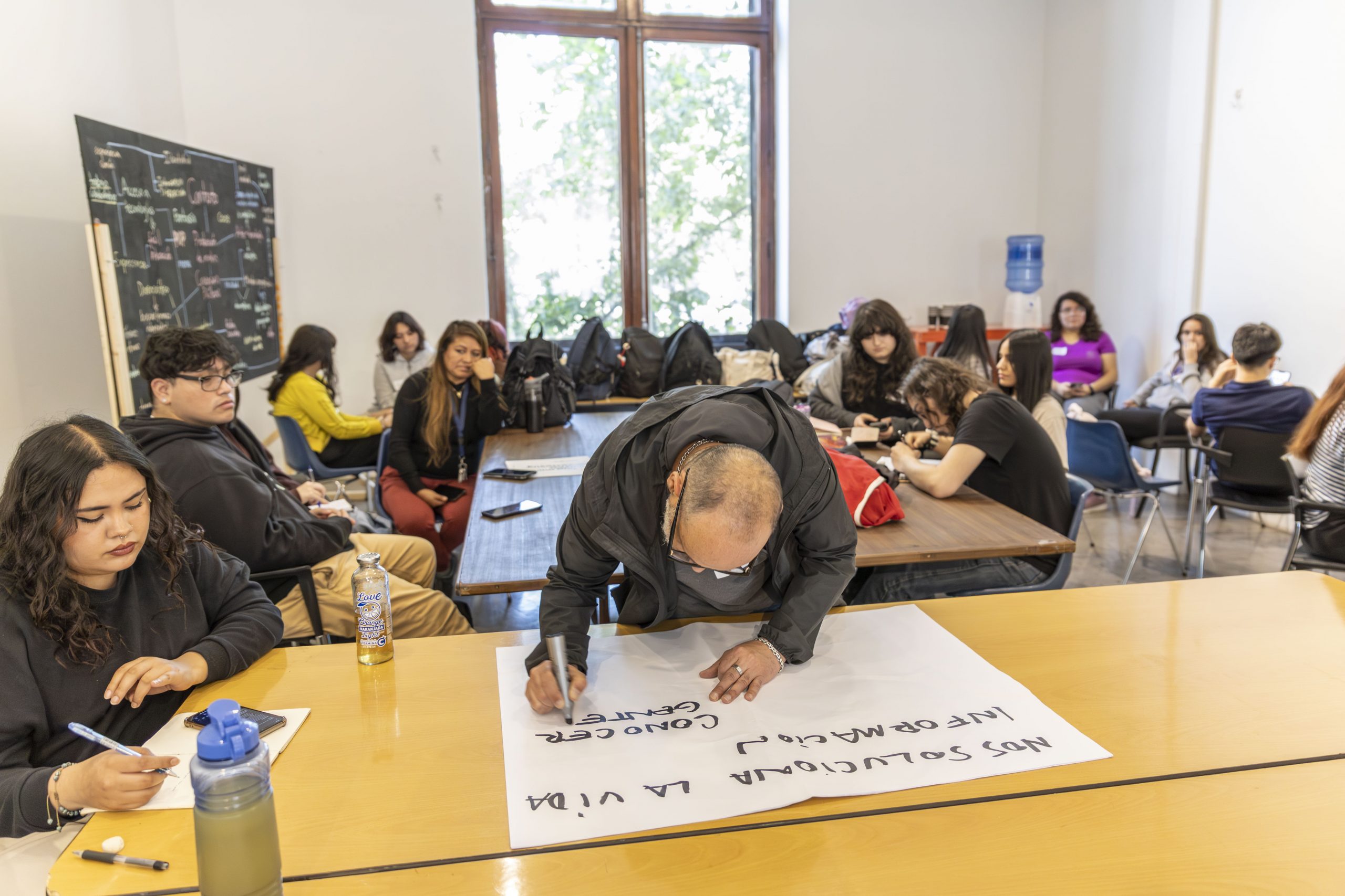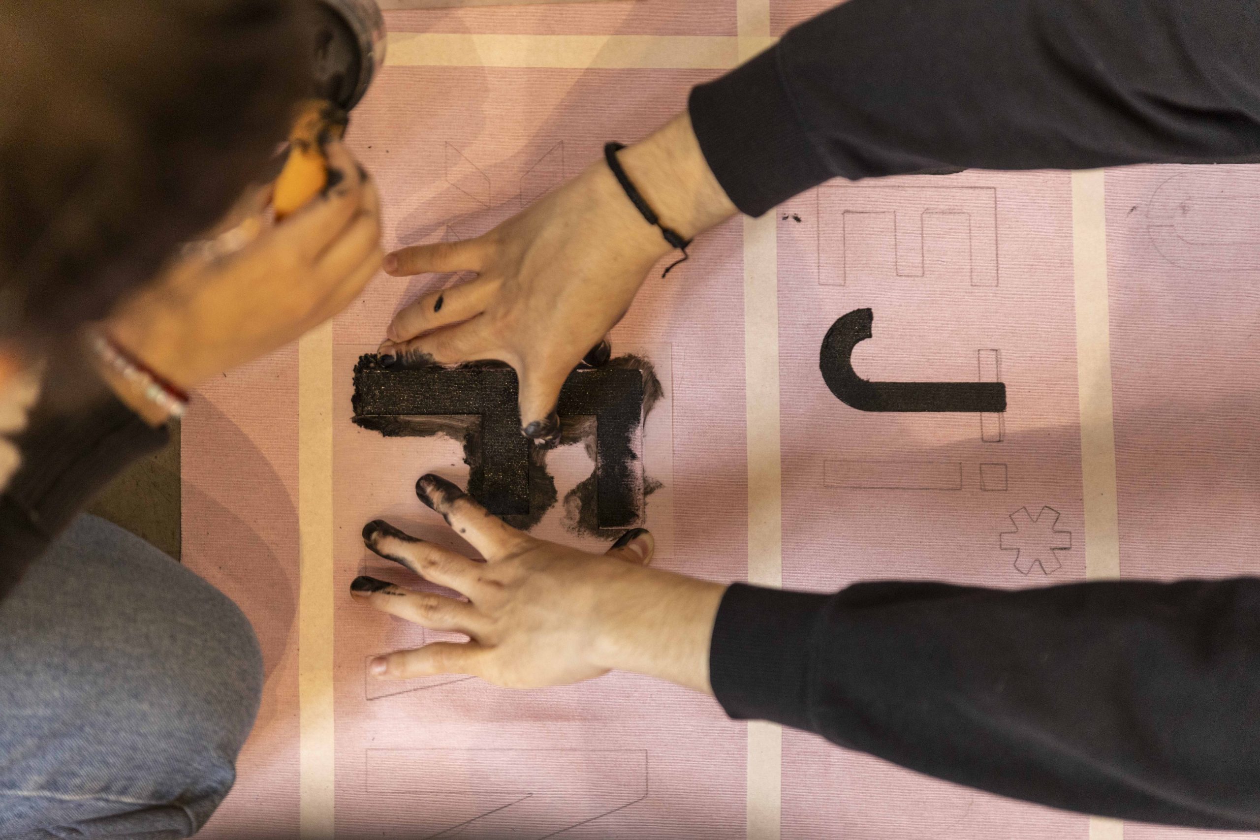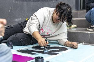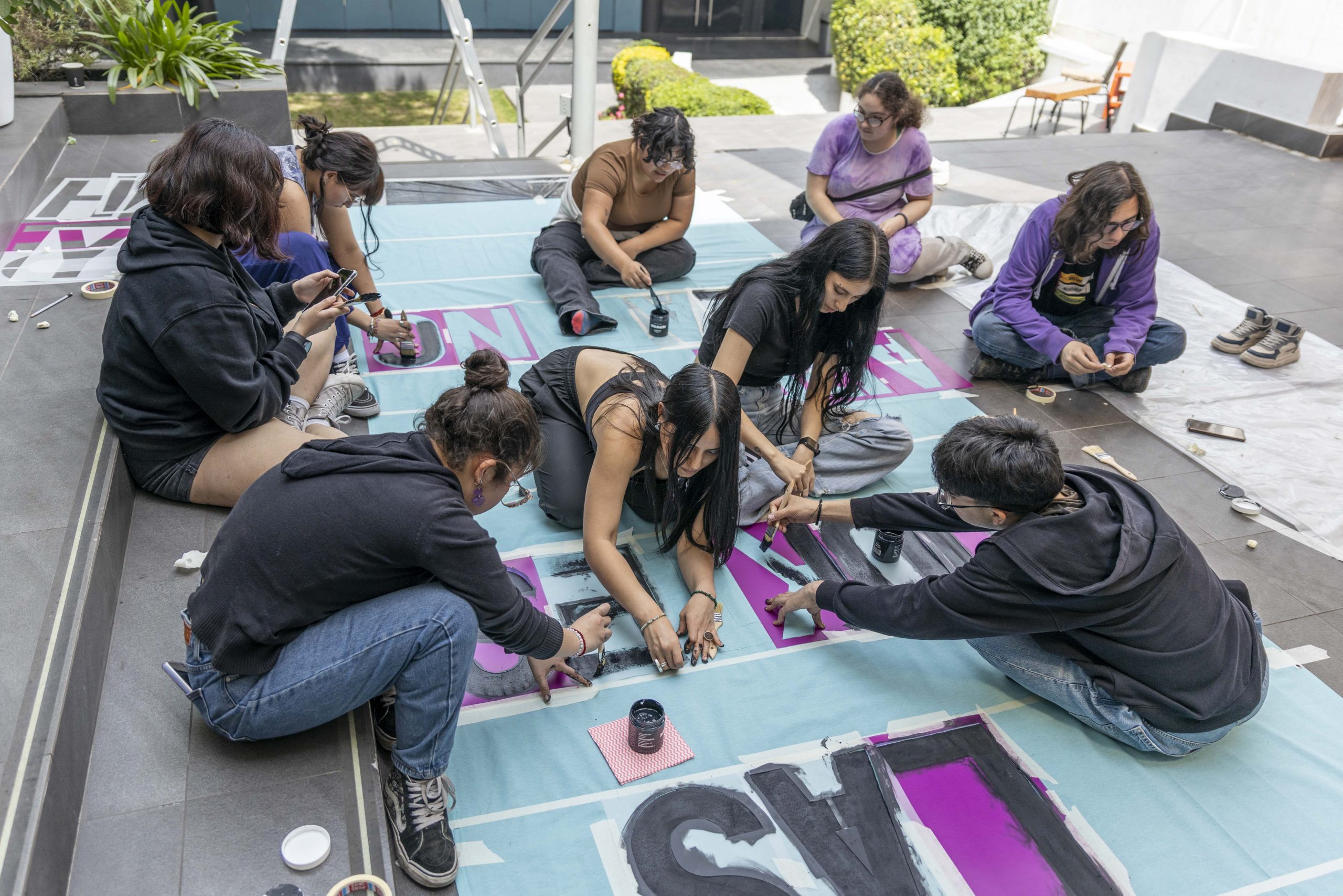 Durante el taller, Marco presentó parte de su investigación doctoral y compartió las inquietudes personales que inspiran su trabajo. La artista propuso una dinámica de conversación en la que las y los estudiantes abordaron diversas problemáticas propias, aplicando luego el mismo proceso que ella utiliza en la creación de sus banderas; definir una frase central, diagramarla y finalmente transferirla mediante el uso de stencils, técnica que combina reflexión conceptual y práctica manual.