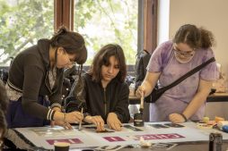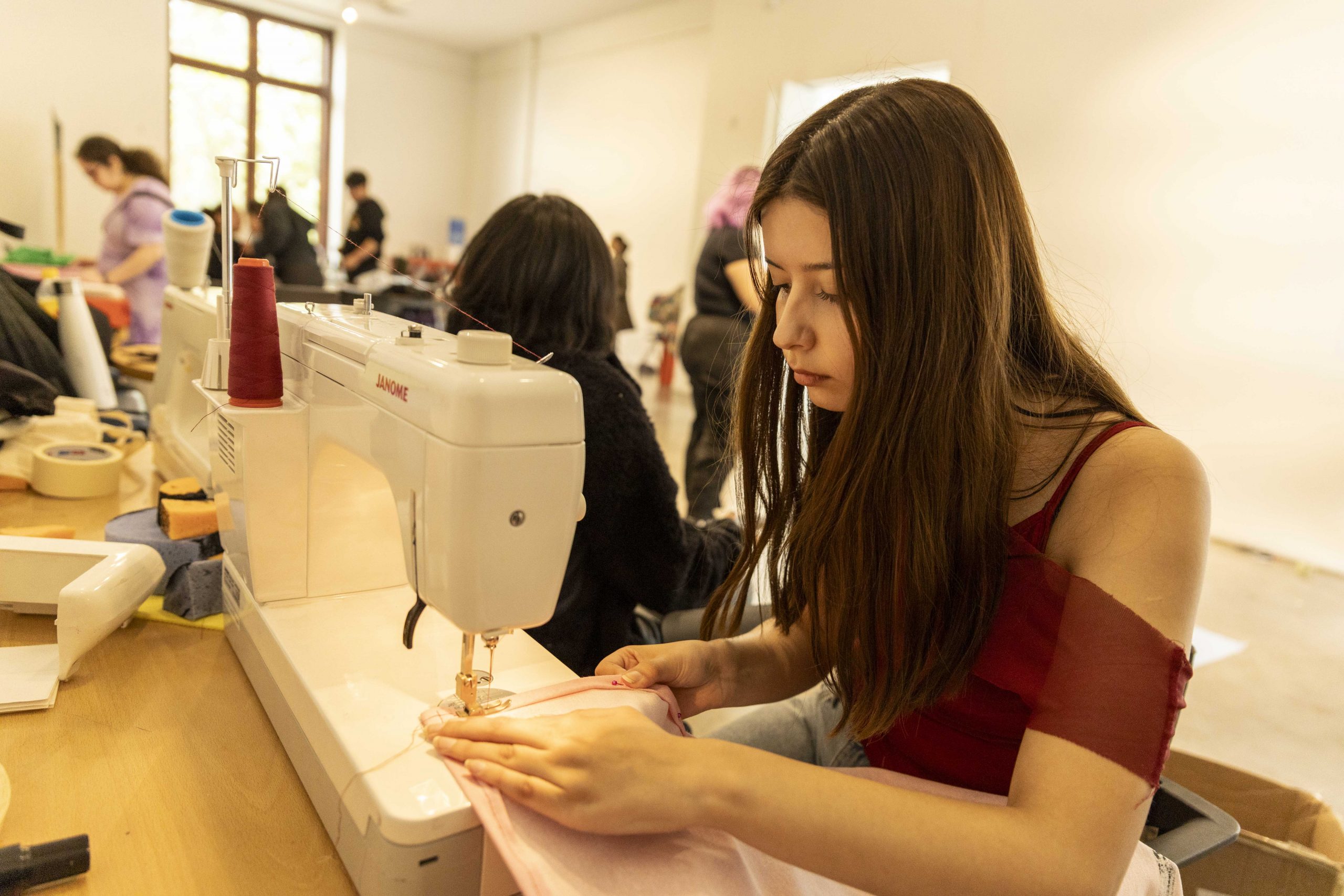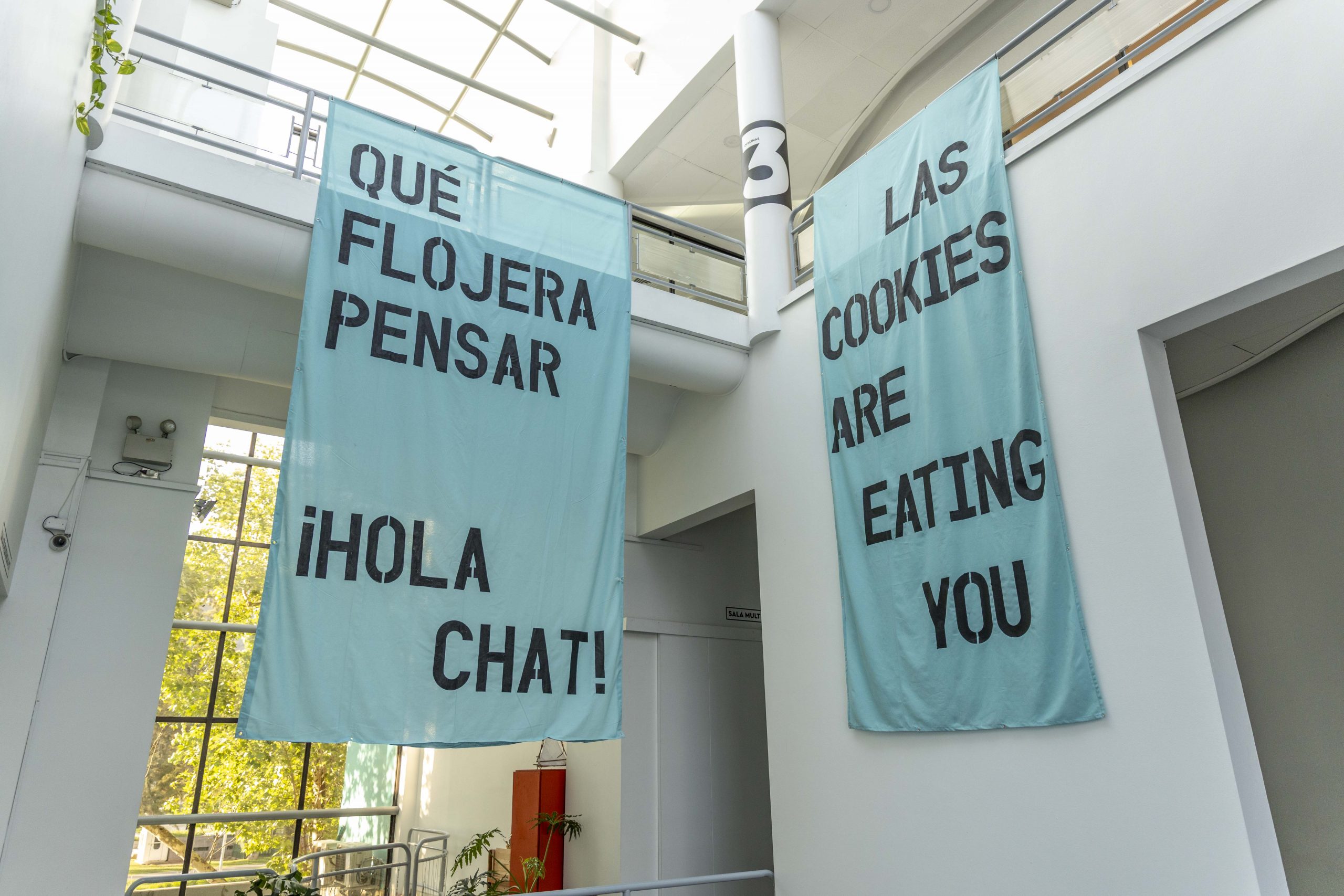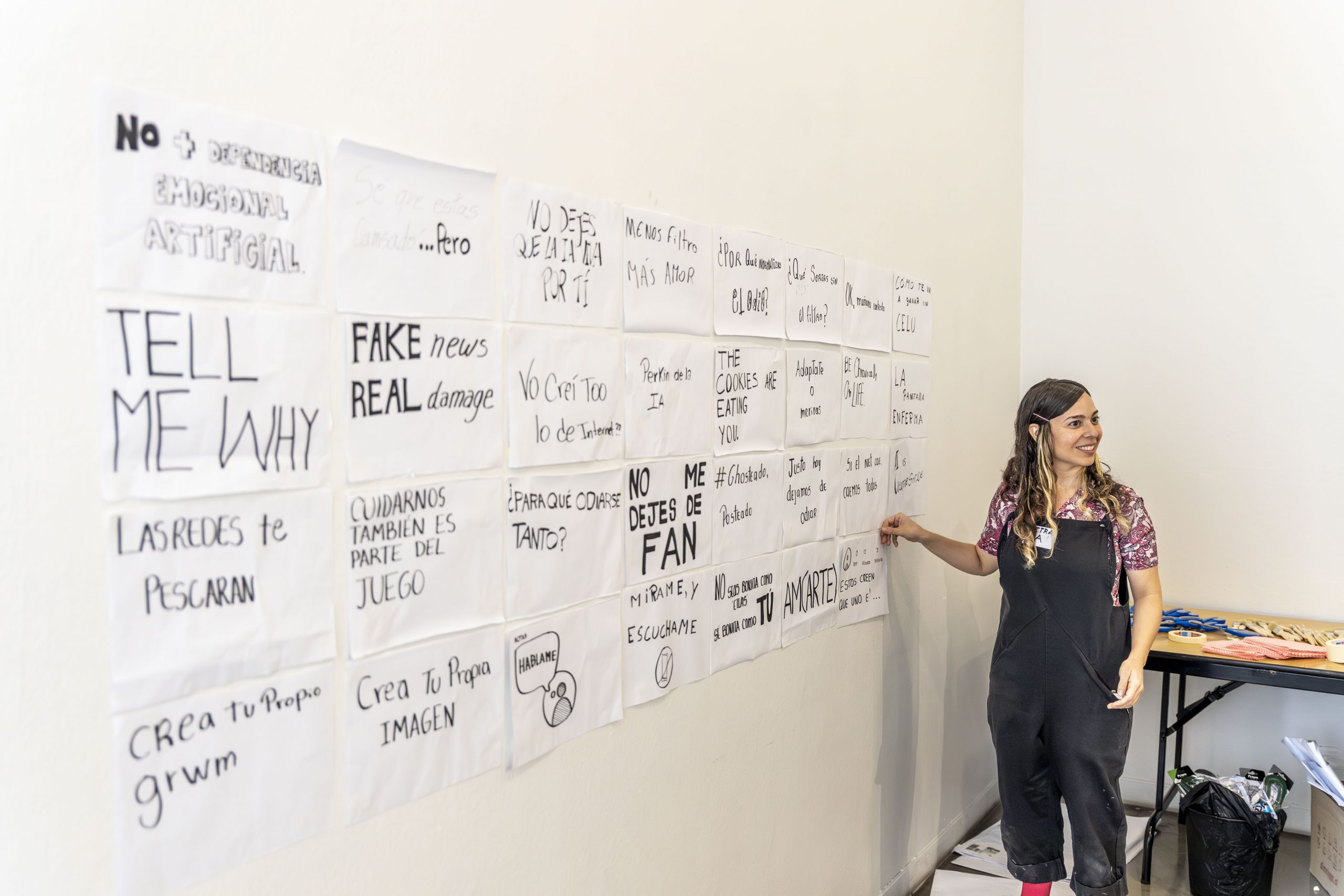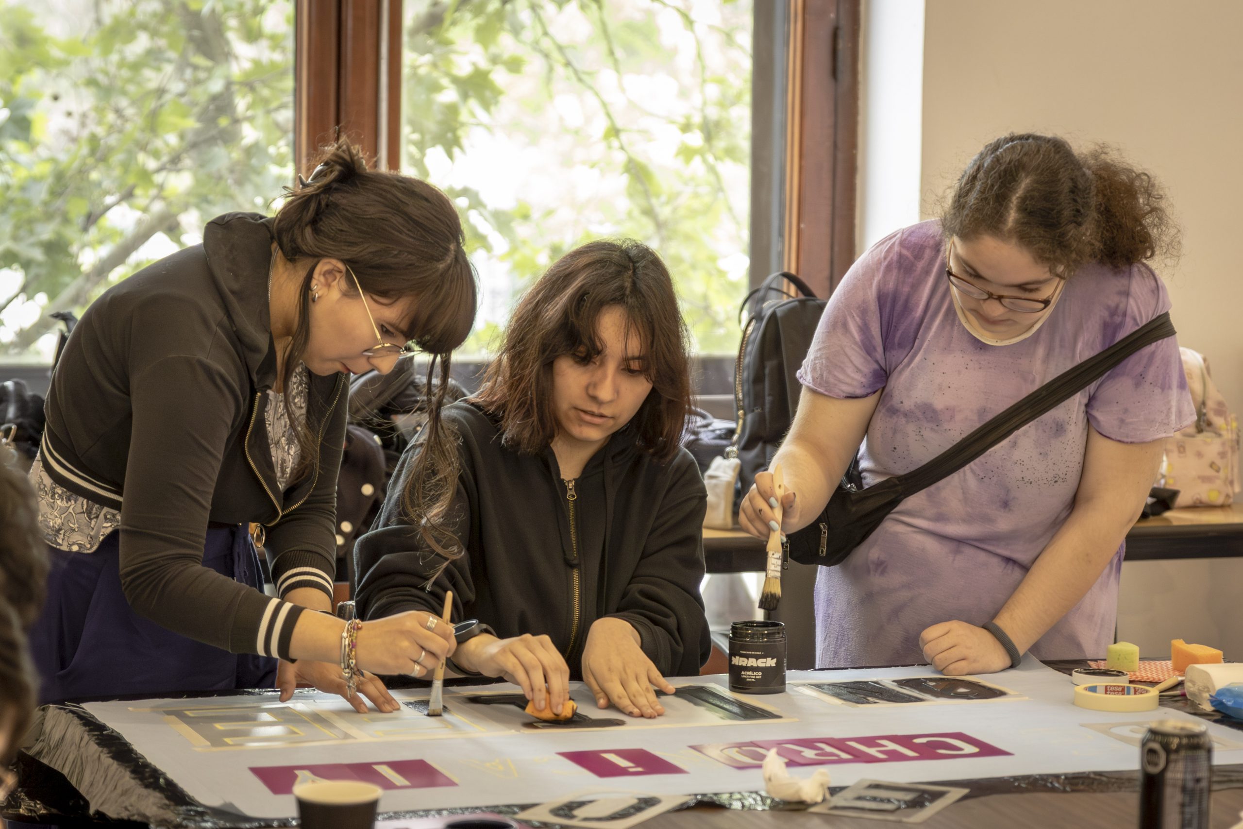 El workshop Internet Flags propuso una experiencia centrada en la palabra escrita como medio de comunicación y expresión visual. A través de la creación colectiva de banderas textiles, las y los estudiantes reflexionaron sobre el uso de la Inteligencia Artificial y de los dispositivos tecnológicos en la vida cotidiana. La actividad invitó a distanciarse de las dinámicas propias del entorno digital para reencontrarse con el trabajo manual, el movimiento y la materialidad del proceso creativo.