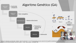 Durante la presentación, Inostroza explicó la relevancia de la superficie de energía potencial (PES) para identificar estructuras de mínima energía y los desafíos de resolver la ecuación de Schrödinger en sistemas complejos. Frente a ello, presentó estrategias híbridas de optimización que combinan métodos determinísticos y estocásticos, integrando además un autómata celular para generar poblaciones químicamente plausibles.