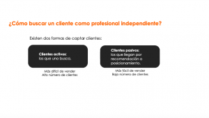 En otras recomendaciones prácticas, comentó que se pueden desarrollar alianzas estratégicas y complementarias entre profesionales independientes (ejemplo: un nutricionista con un psicólogo), o bien establecer «ganchos» para la captación de nuevos clientes, como un descuento inicial o «valor añadido» al servicio (un regalo o servicio adicional).