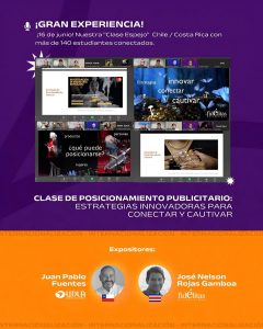 Bernardita Silva, Directora de Escuela de Publicidad de Universidad de Las Américas (UDLA), junto al académico Juan Pablo Fuentes, realizaron una «clase espejo», trabajo colaborativo efectuado con Universidad Fidélitas de Costa Rica. La actividad convocó de manera online a más de 140 alumnos generando una instancia de intercambio de experiencias, conocimientos y cultura en torno a la temática del posicionamiento publicitario.