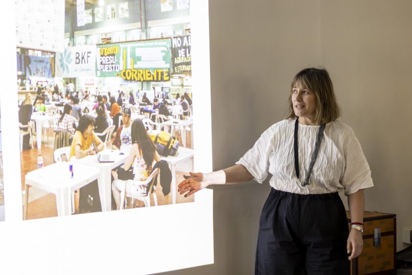 La Doctora en Ciencias Sociales y profesora titular de la Facultad de Arquitectura, Diseño y Urbanismo de la Universidad de Buenos Aires, Griselda Flesler, visitó la Escuela de Animación para guiar un taller en el que estudiantes de tercer año exploraron el Campus Providencia a partir de los cuerpos y las emociones, elaboraron cartografías sensibles que articulan espacio, afecto y aprendizaje.