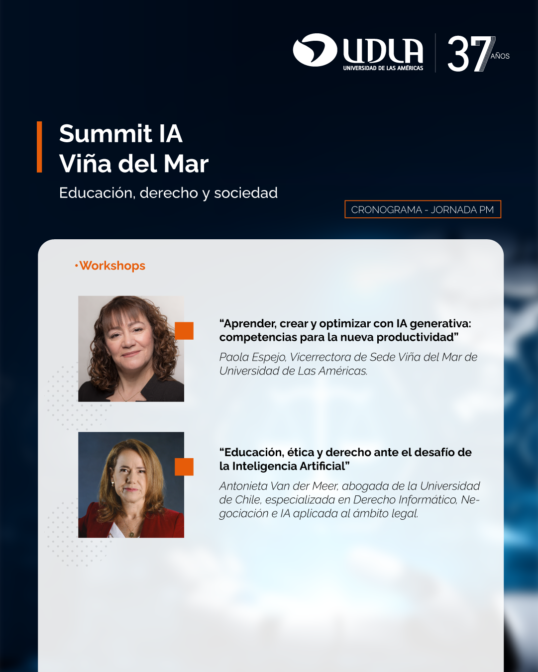 El programa considera dos workshops, uno centrado en educación, ética, derecho e Inteligencia Artificial, y otro orientado al aprendizaje y creación con herramientas de IA aplicadas a la productividad. Además, se realizará una Expo Tecnológica, donde se exhibirán herramientas, soluciones y proyectos desarrollados a partir de estas tecnologías.
