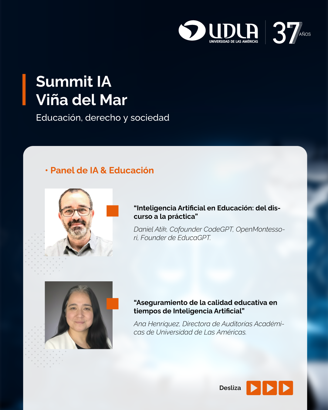 La irrupción de la Inteligencia Artificial (IA) desde la perspectiva de las humanidades, el desafío de educar en tiempos de algoritmos, la sociedad digital y la innovación con responsabilidad colectiva, serán los ejes centrales del “Summit IA Viña del Mar: Educación, Derecho y Sociedad” que se realizará el jueves 27 de noviembre, desde las 8:30 horas, en UDLA Sede Viña del Mar.