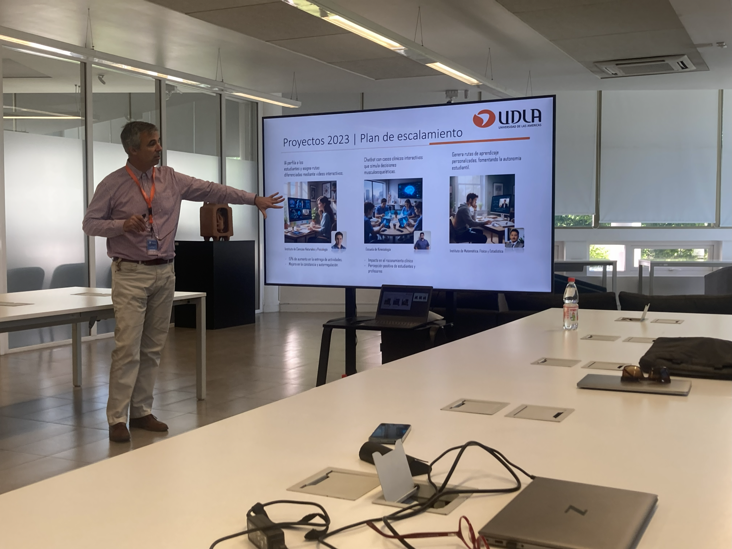 En cuanto a los proyectos sobre los que expuso Fernández, actualmente se encuentra satisfecho por el avance que estos han tenido dentro de UDLA. “Ya hemos puesto en marcha el Guion Pedagógico en cerca de 500 asignaturas dentro de la Universidad, y sobre el Programa de Innovaciones Metodológicas, el 2025 ya contamos con tres proyectos en fase de escalamiento, tres en fase de pilotaje y cuatro en fase de ideación de soluciones”, destacó Fernández.