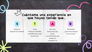 Asimismo, propuso relatar una experiencia que de cuenta de fortalezas a través de la denominada metodología STAR (ver recuadro). «Es una forma más ordenada de cómo uno responde habitualmente. Es bien estructurado y muy aplicable a situaciones que me pueden pedir demostrar en una entrevista laboral», explicó.