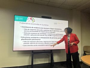 Durante el encuentro, ambas académicas abordaron los mecanismos mediante los cuales algunos deudores obstaculizan artificialmente el pago de pensiones alimenticias y las limitaciones del sistema judicial para identificar ingresos no declarados.