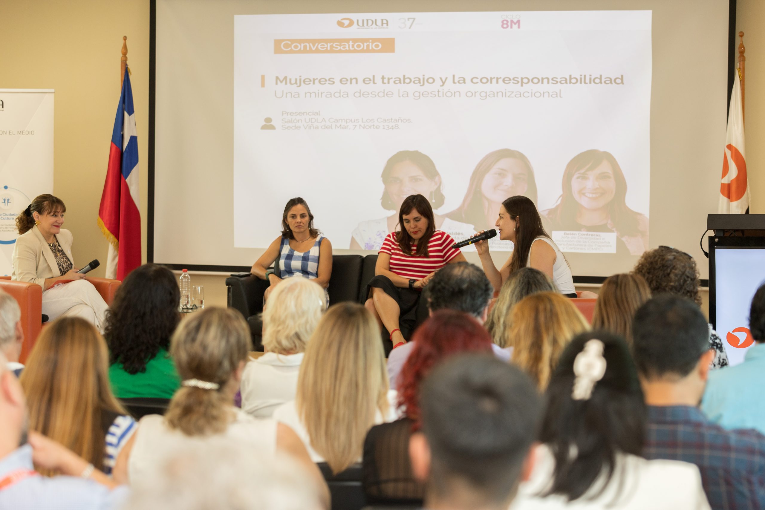 Corresponsabilidad, participación laboral femenina, prácticas organizacionales y políticas públicas vinculadas al desarrollo productivo, fueron parte de las temáticas analizadas en el conversatorio “Mujeres en el trabajo y la corresponsabilidad: una mirada desde la gestión organizacional”, realizado en UDLA Sede Viña del Mar, en el marco del ciclo institucional de actividades por el Día Internacional de la Mujer.