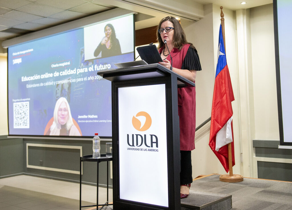 En su exposición, la Doctora Jennifer Mathes —asesora de instituciones educativas en la implementación de modelos de aprendizaje en línea de alta calidad— comentó que “este es un momento maravilloso para estar acá hablando de la educación online”, debido a que “nuestros estudiantes necesitan estar preparados para un futuro marcado por el cambio, la incertidumbre y las oportunidades”, y donde no solo está presente la IA, “que ha cambiado nuestro mundo”, sino un rápido crecimiento del aprendizaje online. La educación está enfrentando estos cambios en tiempo real, expresó, con estudiantes que tienen expectativas distintas a las de hace 10 años: “No es malo que lo online se extienda, pero sí que lo haga en el camino correcto”.
